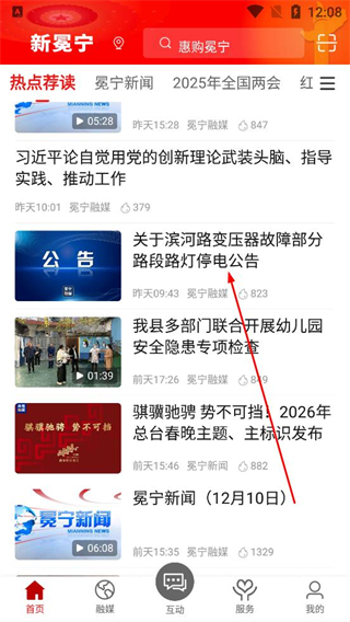 1、打開平臺進入首頁,瀏覽熱點薦讀板塊,選擇關于濱河路變壓器故障的公告,點擊進入詳情頁面。