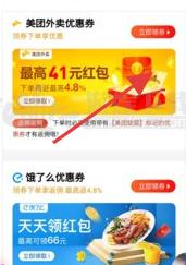 1、美團,餓了么等平臺優惠,像美團最高41元紅包、餓了么天天領紅包,點擊對應區域,可領券享受訂餐優惠,助力省錢點外賣。