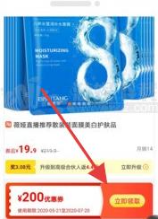 2、展示商品如八杯水面膜及大額優惠券,點擊立即領取,可獲取200元優惠券,下單時抵扣金額,降低購物成本。