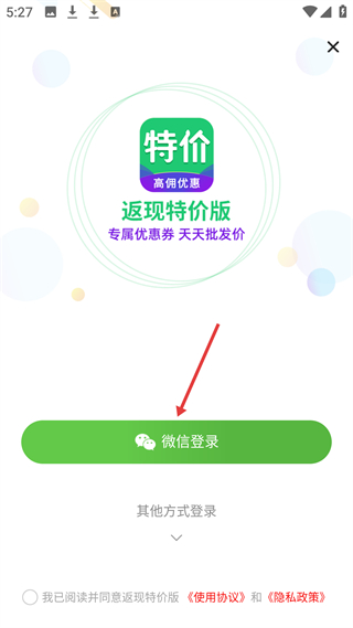 1、登錄板塊,名為返現特價版,提供微信登錄入口,需同意協議政策,呈現用戶登錄功能內容。