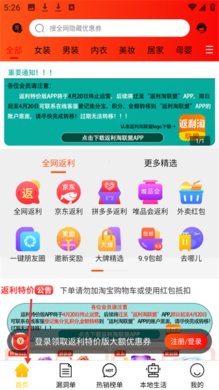 2、首頁板塊,有搜優惠券功能,展示全網返利等入口,呈現返利公告,方便用戶查找優惠返利渠道。
