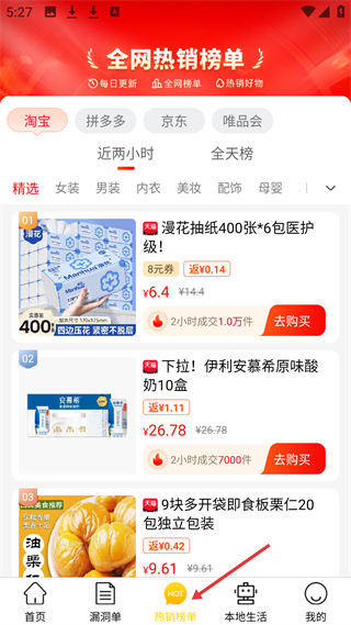 3、熱銷榜單板塊,展示多平臺熱銷商品,標注價格返利及成交件數,方便用戶選購熱門優惠商品。