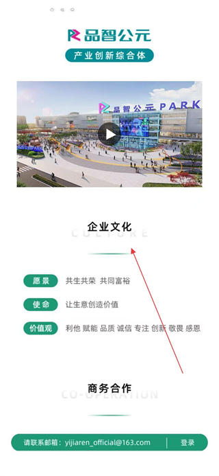 4、查看企業文化板塊了解品牌的愿景、使命與價值觀,同時可獲取商務合作的聯系郵箱等信息。