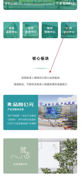 2、登錄后查看核心板塊介紹了解蟻家人的四大核心業務板塊,以及品智公元等產業創新綜合體的信息。