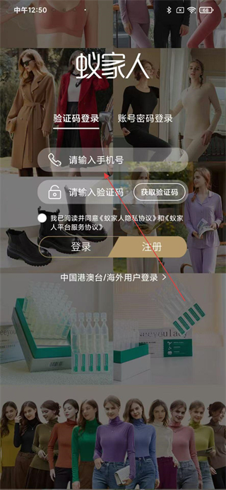 1、進入蟻家人登錄頁,選擇驗證碼登錄,輸入手機號碼,點擊獲取驗證碼并填入,勾選協議后完成登錄。