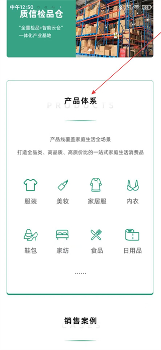 3、瀏覽產品體系板塊查看涵蓋服裝、美妝、家居服等全品類的家庭生活消費品布局,了解產品覆蓋場景。
