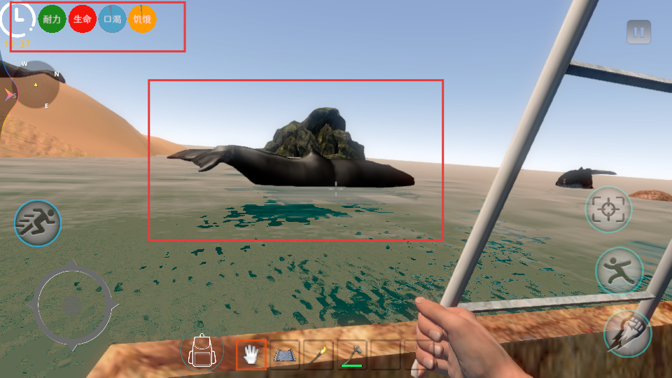 1、點擊開始游戲,進入游戲場景,需關注耐力、生命、口渴、饑餓等狀態,在環境中探索,尋找生存資源。