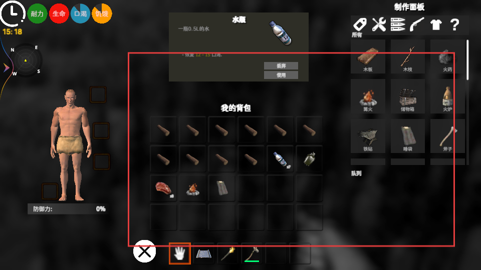 3、打開背包,查看收集到的物品,利用制作面板,選擇木板、木枝等材料,制作篝火、工具箱等生存工具。