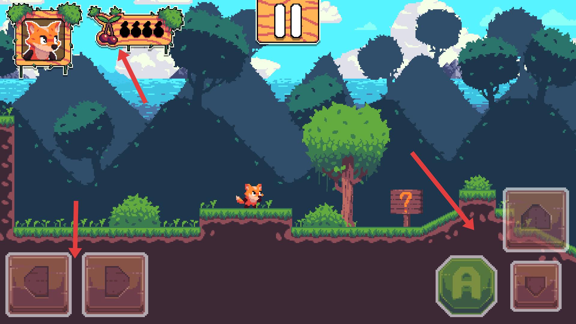 4、進入游戲操控狐貍角色在場景中移動,注意收集櫻桃,利用下方的方向按鈕和右側的功能按鈕,在關卡中探索前進。