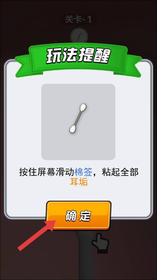 1、關卡開始前會有玩法提醒,此關需按住屏幕滑動棉簽粘起全部耳垢,了解后點擊確定進入游戲。