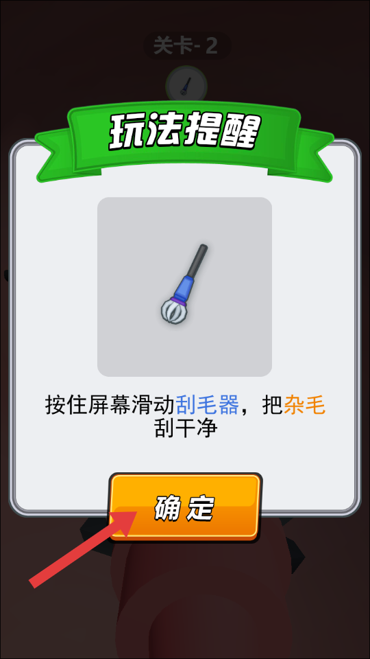 4、到關卡2,玩法提醒提示按住屏幕滑動刮毛器把雜毛刮干凈,明確玩法后點擊確定開始該關卡。