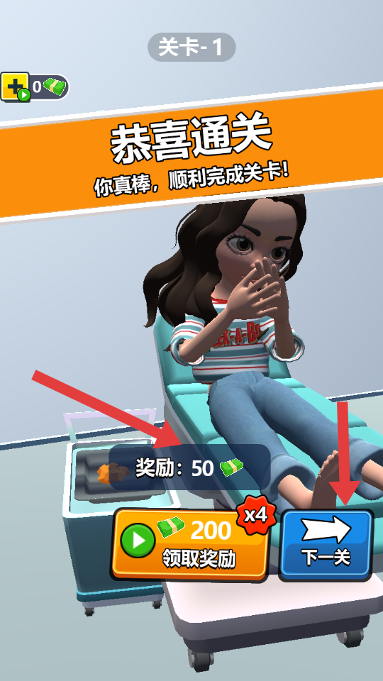 3、成功通關關卡1后,會顯示恭喜通關,還能獲得獎勵50,可選擇領取獎勵或點擊下一關繼續游戲。