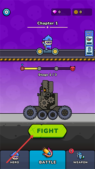 1、選擇章節和關卡后,點擊FIGHT,開啟機械闖關挑戰,駕駛載具進入戰斗場景,準備對抗敵人。