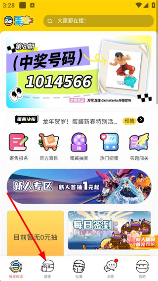 1、打開蛋醬APP,進入首頁,查看寄售報告、官方直售等功能入口及主題蛋機預告,熟悉界面布局。