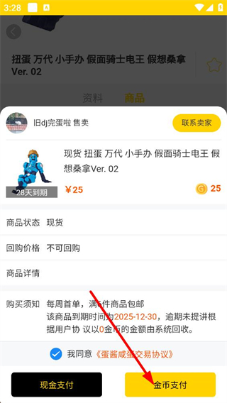 4、交易確認界面,勾選同意相關協議后,可選擇現金支付或金幣支付方式,完成對應支付操作,確認購買該商品。