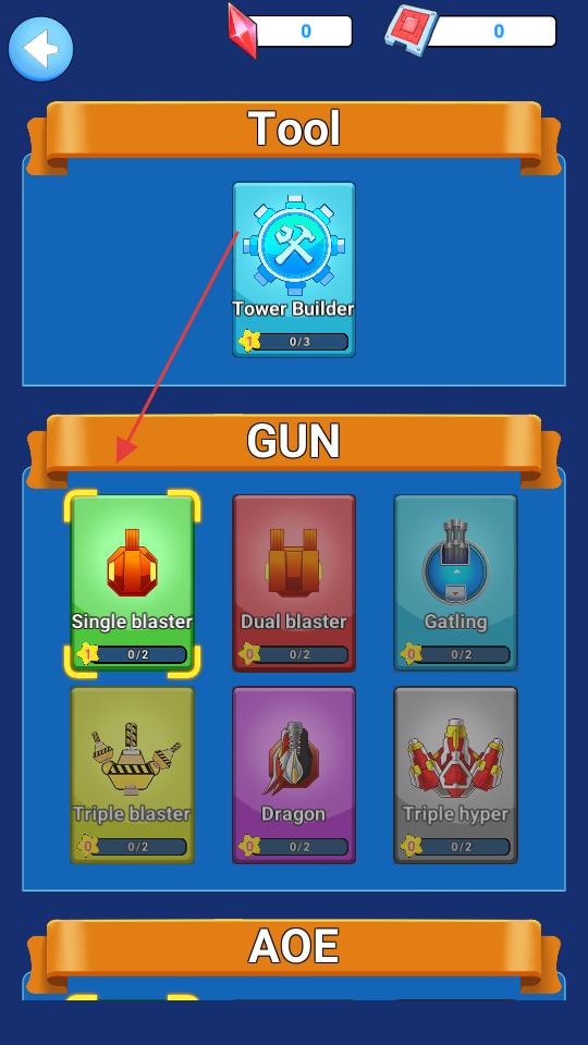 2、界面分為工具和槍械等部分,工具類有建塔工具,槍械類包含多種發射器卡片,每種卡片都有獲取數量的顯示。