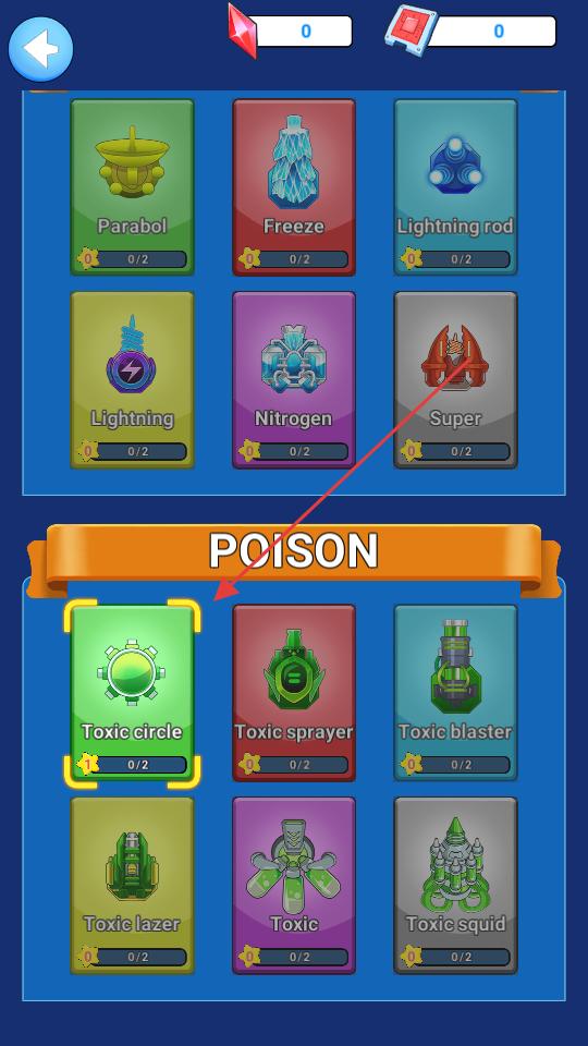 4、游戲的卡片界面,有多種屬性的卡片,像拋物、冰凍類,還有毒系的卡片,如毒圈、毒噴霧等,可供玩家選用。