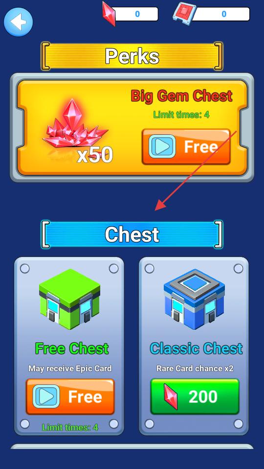 3、游戲的寶箱與福利界面,Perks里有可免費獲取的大寶石箱,Chest有免費和經典兩種寶箱,獎勵各有不同。
