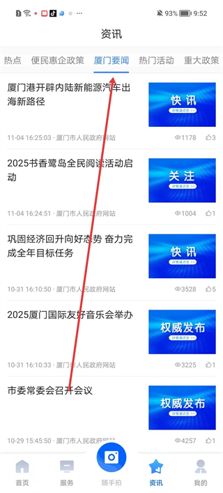 4、進入資訊板塊選擇廈門要聞分類,可查看廈門港開辟新能源汽車出海路徑、書香鷺島閱讀活動啟動等本地資訊,了解廈門的政務和社會動態。