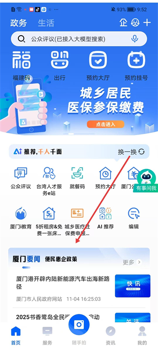 1、進入首頁可查看福建碼、出行等功能入口,了解城鄉居民醫保參保繳費入口,點擊換一換可查看不同的推薦服務。