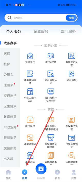 3、在服務頁面的政務辦事板塊可查看醫保、社保等個人服務分類,選擇對應的政務辦事功能如預約大廳、商事登記等,可辦理相關政務業務。
