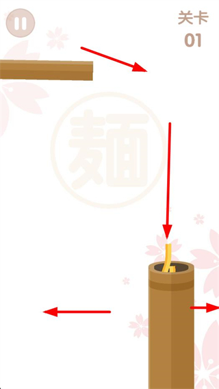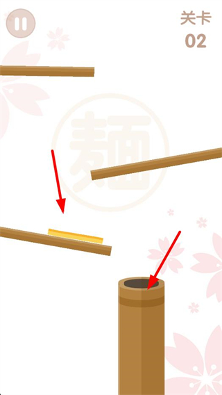 第7關:面條從空中平行滑落,竹筒口用放在面條的正中間即可接住,位置在如上圖位置,自己多試試自己感受下,這關也不是很難。