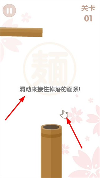 1、查看關卡提示,通過滑動操作控制容器移動,接住掉落的面條,開啟關卡的接面條挑戰流程。