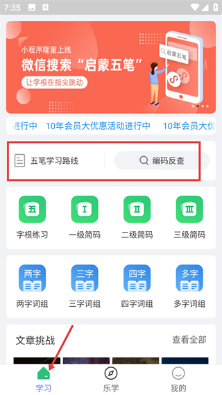 2、學習頁面可進行字根練習、各級簡碼及不同字數詞組練習,還有文章挑戰,底部設學習、樂學、我的導航欄。