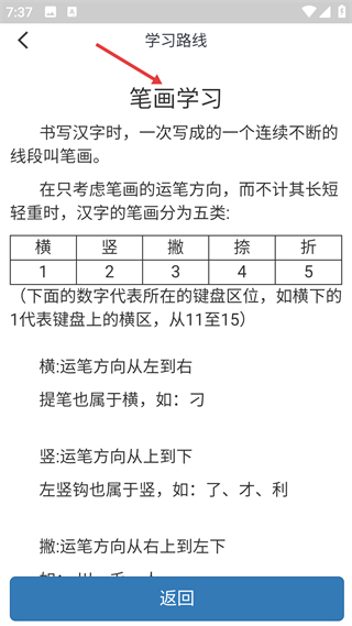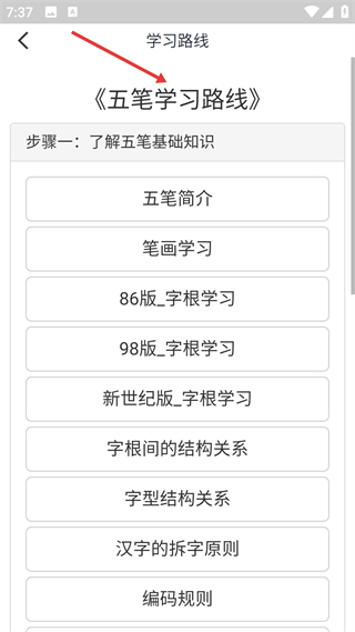 3、學習路線,首步為基礎知識學習,涵蓋五筆簡介等多項內容,幫助用戶系統掌握入門知識。