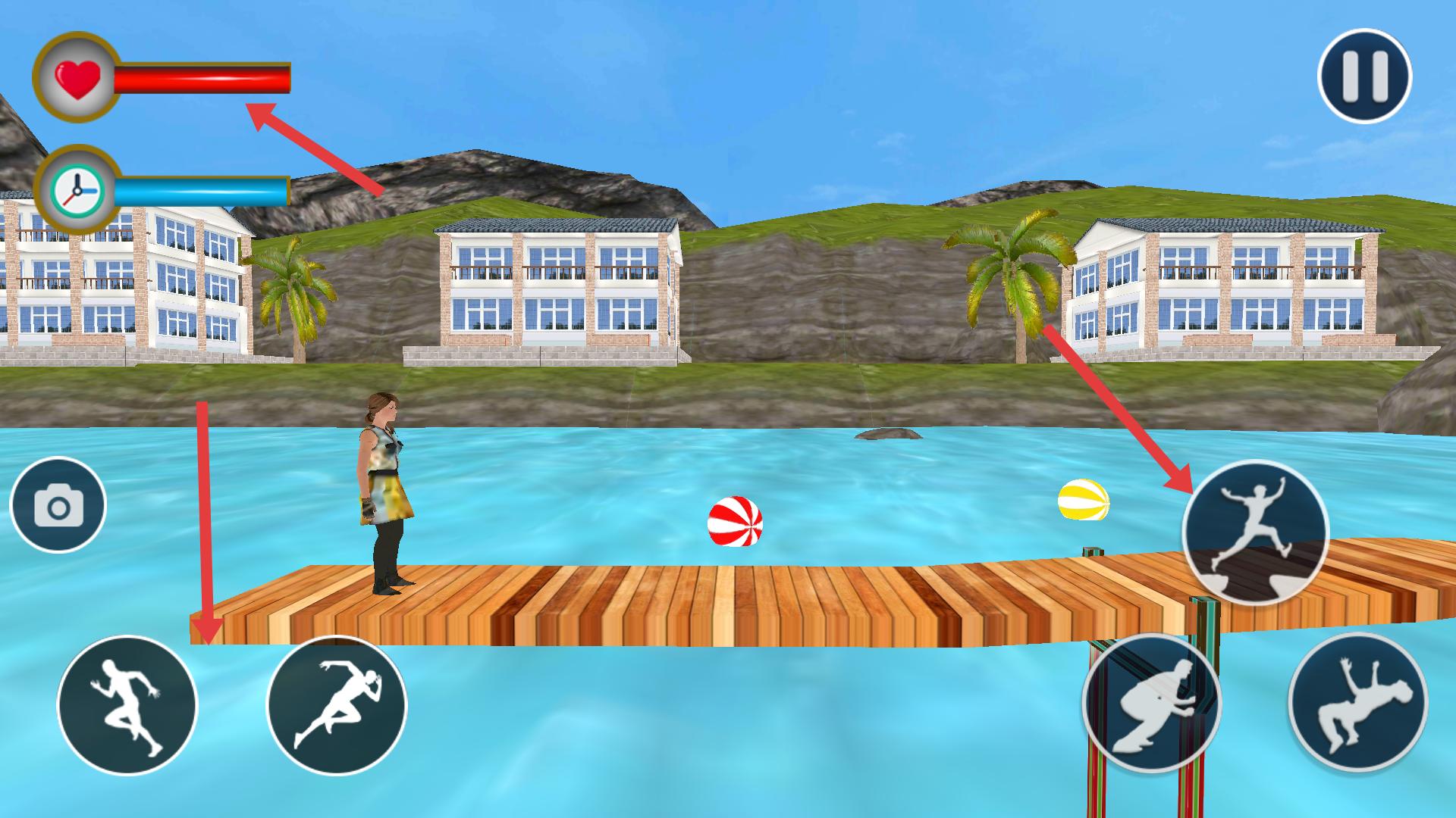 3、進入游戲操控角色在水上平臺活動,利用左下角的奔跑等按鈕移動,右上角的跳躍按鈕跨越障礙,同時留意左上角的生命值和時間條。