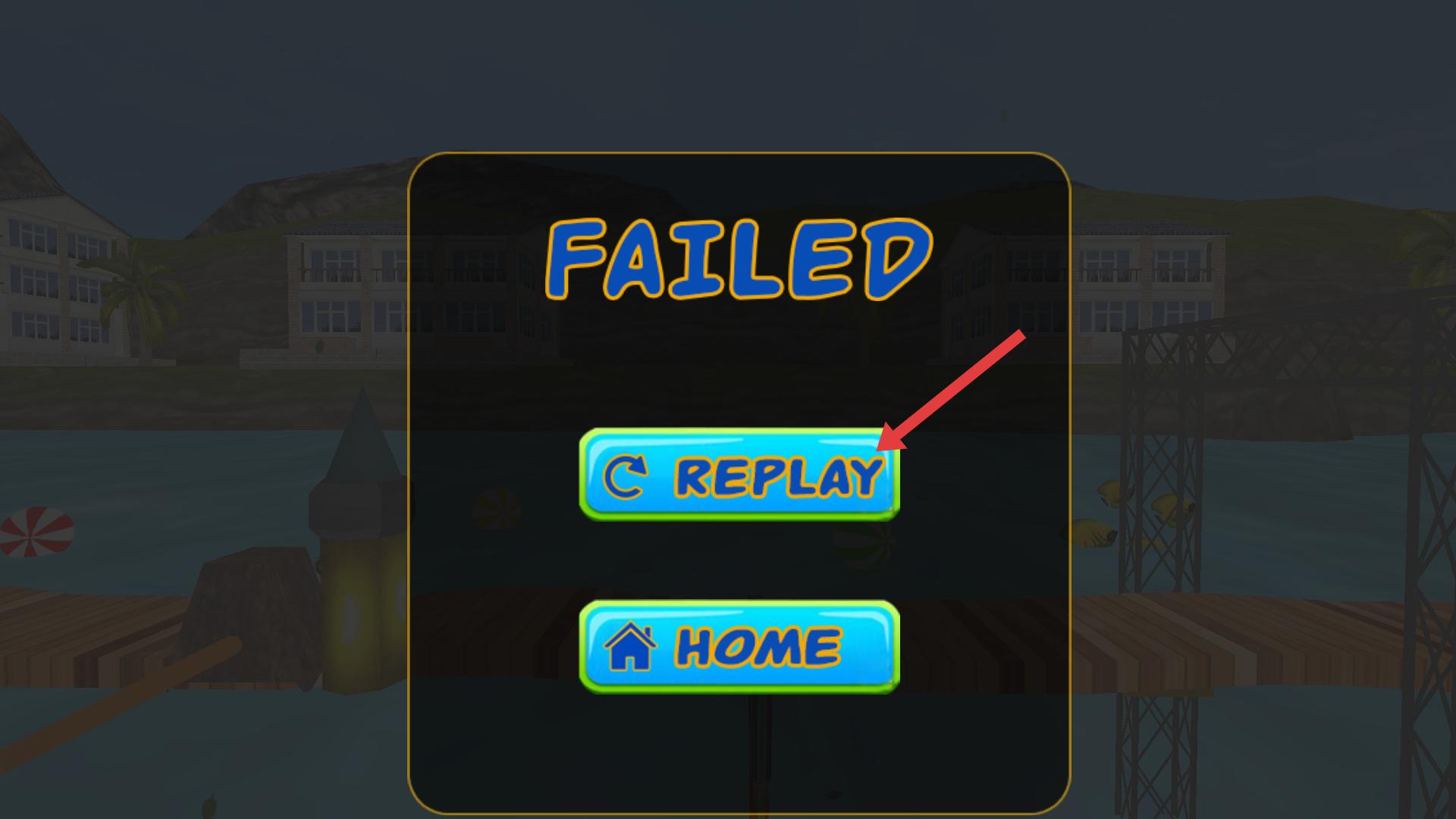 4、若游戲失敗,界面會顯示FAILED,點擊REPLAY按鈕,可重新挑戰當前關卡,繼續游戲。