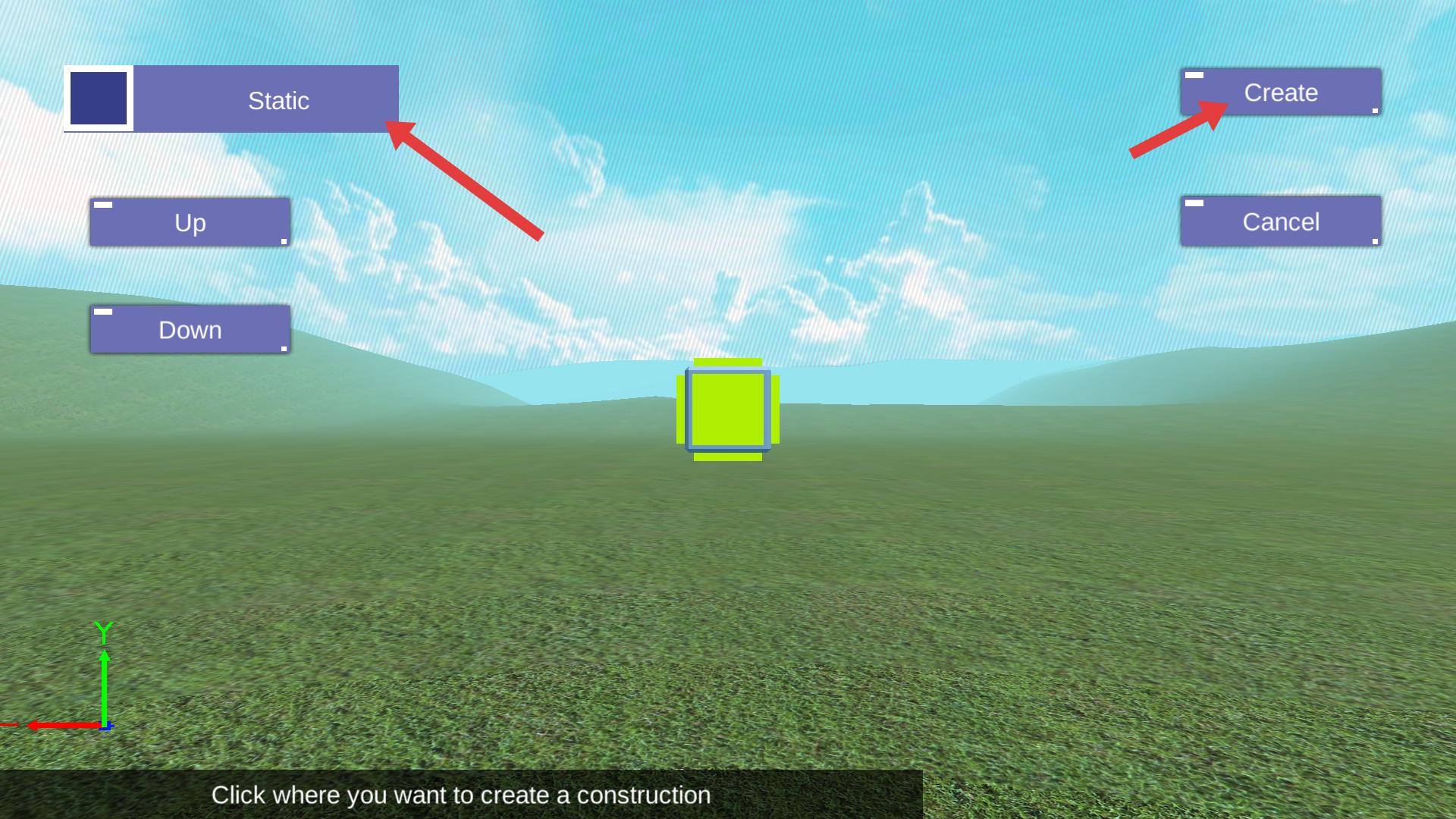 2、選擇static類型后,點擊Create按鈕可在想要建造的位置創建結構,還能通過Up,Down按鈕調整,按照提示點擊對應位置完成建造。