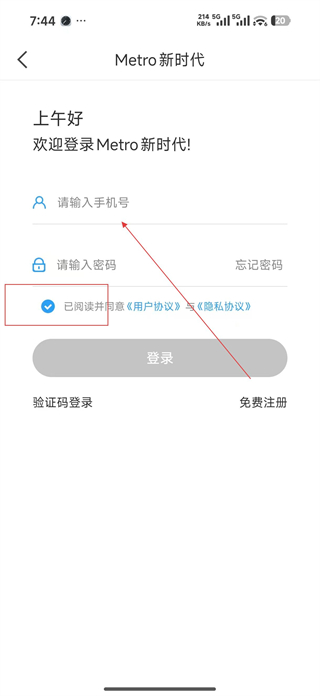 1、進入用戶登錄頁面,輸入手機號和密碼,勾選已閱讀并同意相關協議,可選擇驗證碼登錄或免費注冊完成賬號登錄。