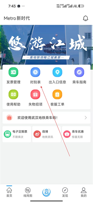 3、進入發現頁點擊紅框內電子發票時刻表等圖標可查詢下載發票查看地鐵運營時刻。