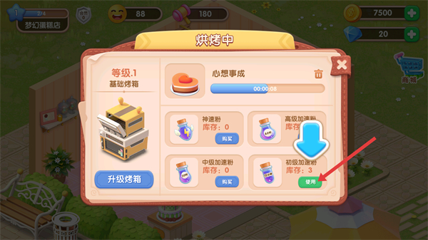 4、在烘烤過程可使用加速道具如初級加速粉,點擊使用按鈕來縮短蛋糕烘烤時間,助力蛋糕店經營。