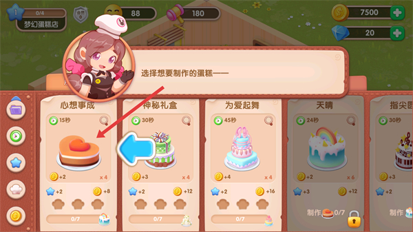 2、可以選擇想要制作的蛋糕,如心想事成、神秘禮盒等不同款式,每種蛋糕制作時間和收益不同,按需選擇制作。