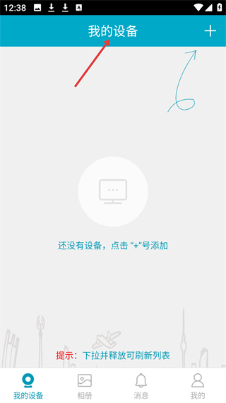 1、我的設備頁,顯示無設備可點擊+添加,下拉可刷新列表,助力管理智能攝像機設備。