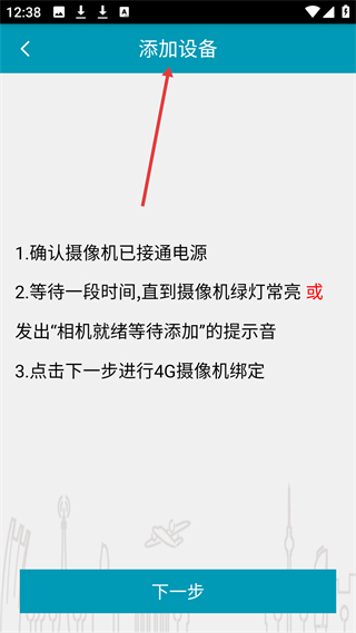 2、添加設備頁,需確認攝像機通電,待綠燈常亮或提示音后點下一步,進行4G攝像機綁定。