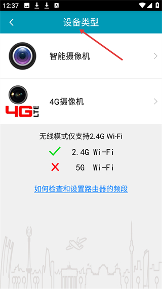 3、設備類型頁,有智能攝像機、4G攝像機可選,無線僅支持2.4GWi-Fi,方便選對應設備類型。