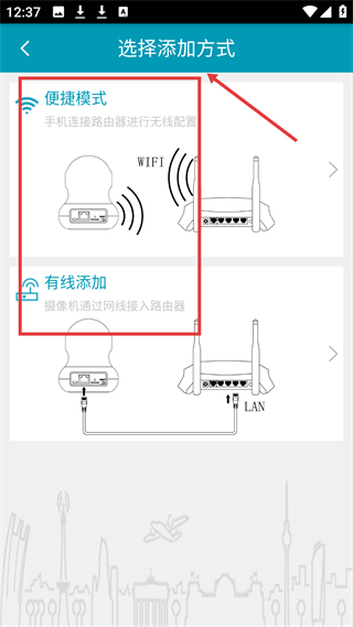 4、添加方式頁,有便捷模式手機連路由器無線配置和有線添加攝像機網線接路由器,供選添加方式。