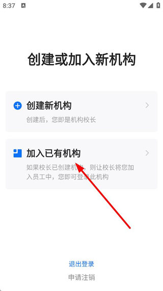 1、進入創建或加入新機構頁面,找到加入已有機構選項,點擊該選項,進入對應的頁面,為后續的操作鋪墊好流程。