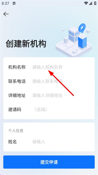 3、進入創建新機構頁面后,看到機構名稱聯系電話等填寫項,需依次填寫對應信息,以便推進后續的申請流程。