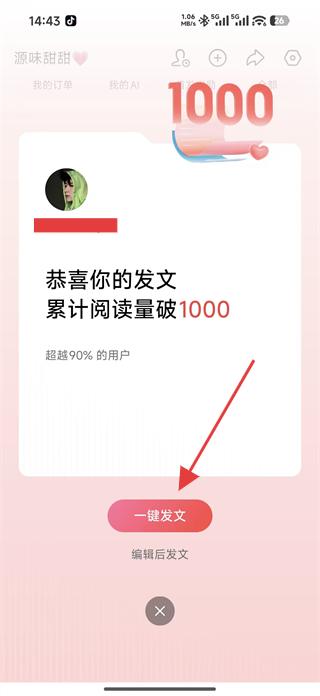 1、打開今日頭條軟件,看到發文累計閱讀量破1000的提示,可選擇一鍵發文或編輯后發文,完成內容發布。