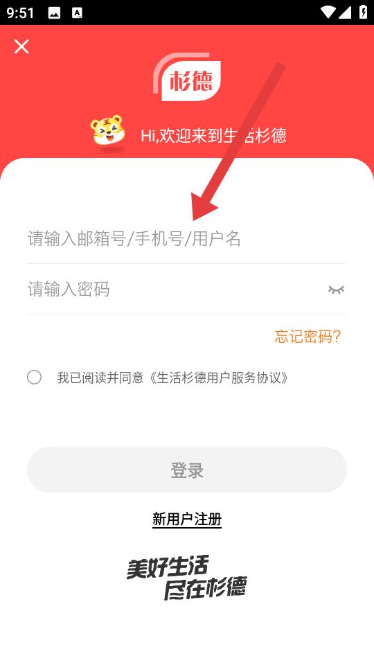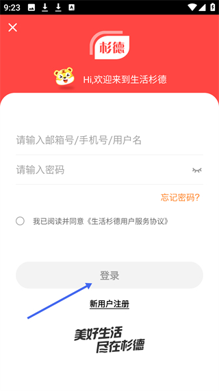 1、登錄頁,有杉德標識和老虎圖標,需輸入賬號密碼、勾選協議后登錄,也可新用戶注冊。
