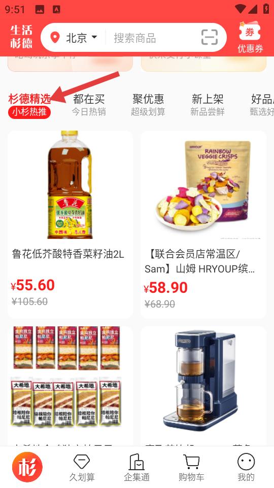 3、精選等分類標簽,展示魯花低芥酸特香菜籽油、山姆果蔬脆等商品,標注優惠價格,搭配清晰圖片,方便用戶瀏覽選購日常所需。