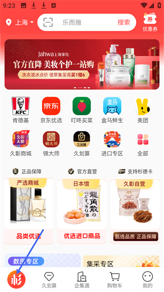 2、首頁,定位上海,有搜索欄和優惠券入口,展示上海家化美妝個護推廣,還有肯德基、京東優選等服務入口及商品板塊。