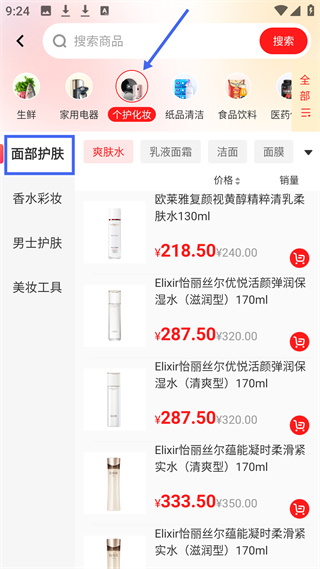 3、個護化妝分類頁,可選生鮮等分類,面部護膚爽膚水子分類下有歐萊雅、怡麗絲爾等品牌護膚品,標注價格和優惠。