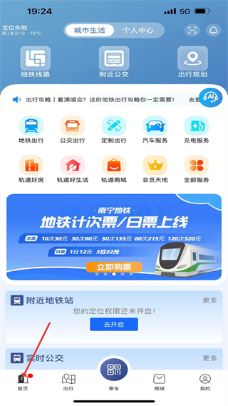 1、首頁有地鐵線路等功能入口,還有出行服務分類及計次票購買入口,方便用戶進行地鐵出行操作。