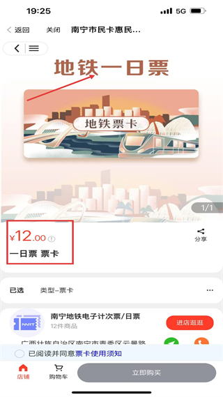 2、地鐵一日票界面展南寧地鐵一日票,價格12元,用戶可讀須知后購買,滿足短期地鐵出行票務需求。