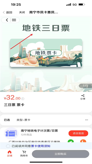 3、地鐵三日票界面展南寧地鐵三日票,價格32元,用戶可讀須知后購買,適合多日地鐵出行票務需求。